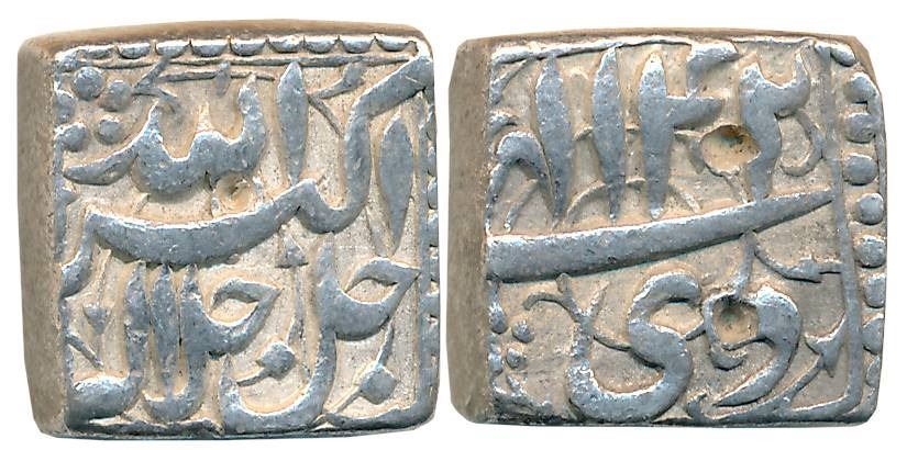 Akbar, Silver Square Rupee, 11.33g, “Jalalahu- Mintless” type, Ilahi Month Di, Year 42 (KM# 91.1). Very fine+.