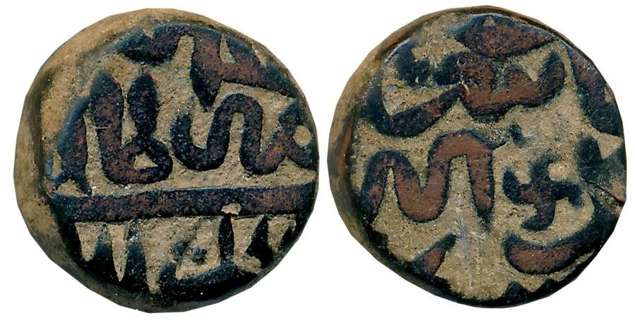 Akbar, Copper 1/2 Dam, 9.99g, “Mangadh” type, Swastika in center. Very fine.