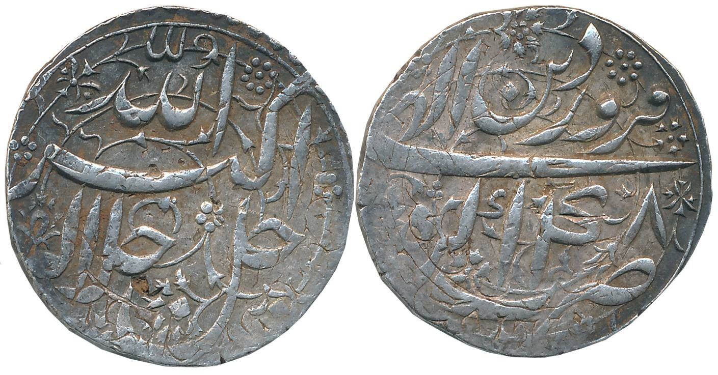 Akbar, Silver Rupee, 11.42g, Broad flan, 30mm, “Jalalahu” type, Agra Mint, Ilahi Month Farwardin, Year 48. Very fine+, extremely rare.