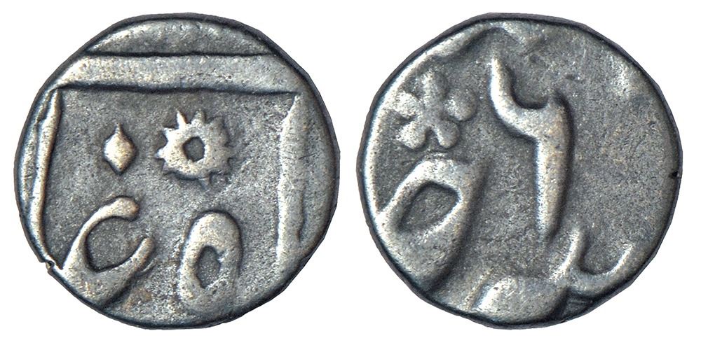 Alamgir II (1754-1759 AD), silver 1/8 rupee, in the name of Alamgir II, mint off flan but attributed to Murshidabad mint, ND/RY 6, sun burst symbol on obverse and five petal flower symbol on reverse, 1.38g.