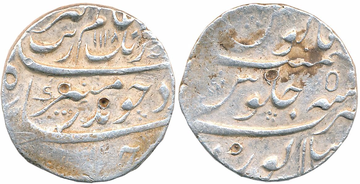 Aurangzeb, Silver Rupee, g, Mailapur Mint, AH 1118/ RY 5(0) (KM# 300.57). Complete mint name on bottom of reverse. Very fine+, rare.