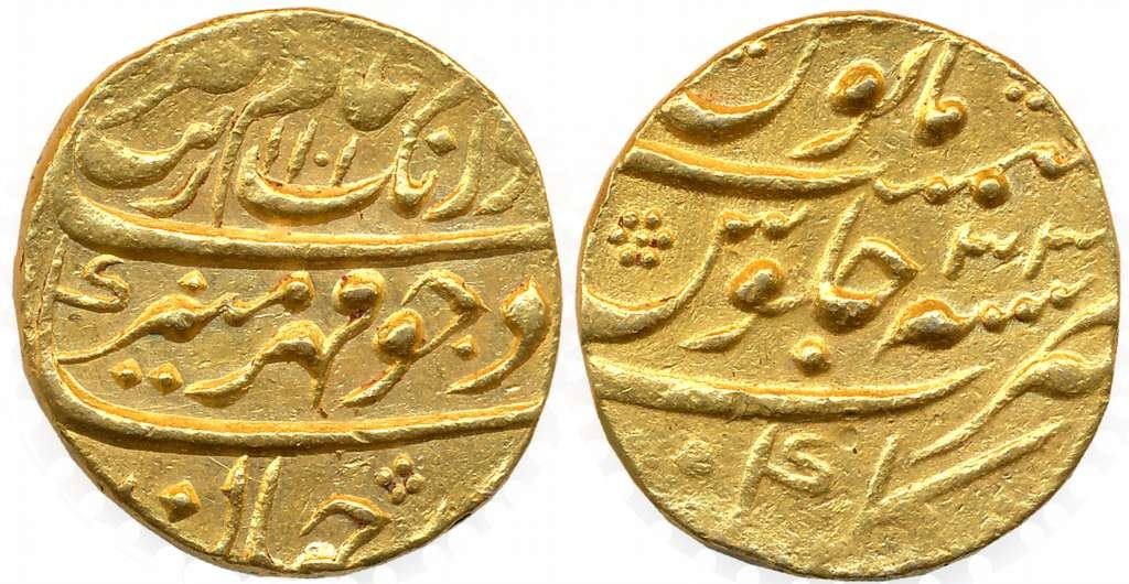 Aurangzeb, Gold Mohur, 10.98g, Gulbarga Mint, AH 1101/ AH 33 (KM# 315.19). Very fine+, rare.