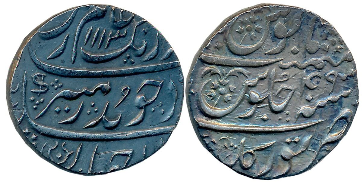 Aurangzeb, Silver Rupee, 11.14g, Torgal Mint, AH 1113/ RY 49 (Year not listed in KM) (KM# 300.88). Complete Mint name on bottom of reverse. Rainbow toning. Uncirculated, rare in this grade.