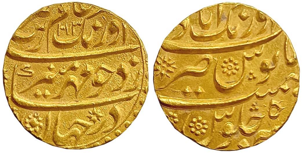 Aurangzeb, Gold Mohur, 10.98g, Aurangabad Mint (on top), AH 1073/ RY 5, complete Mint name on top of reverse (KM# 315.10). Beautiful rossets on both sides. Deep bold strike, uncirculated, very rare in this grade.