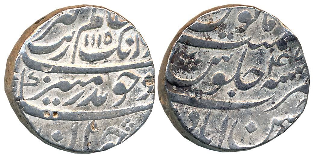 Aurangzeb, Silver Rupee, 11.49g, Ahsanabad Mint, AH 1115/ RY 47 (KM# 300.4). Complete Mint name on bottom of reverse. Very fine+.