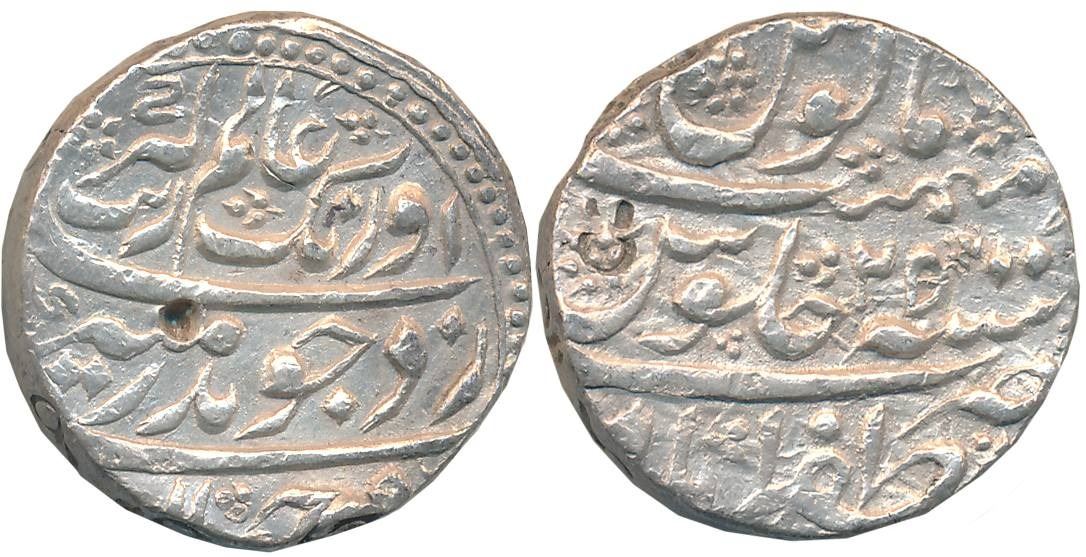 Aurangzeb, Silver Rupee, 11.48g, Zafarabad Mint, RY 25 (KM# 300.93). Complete Mint name on bottom of reverse. Very fine+.