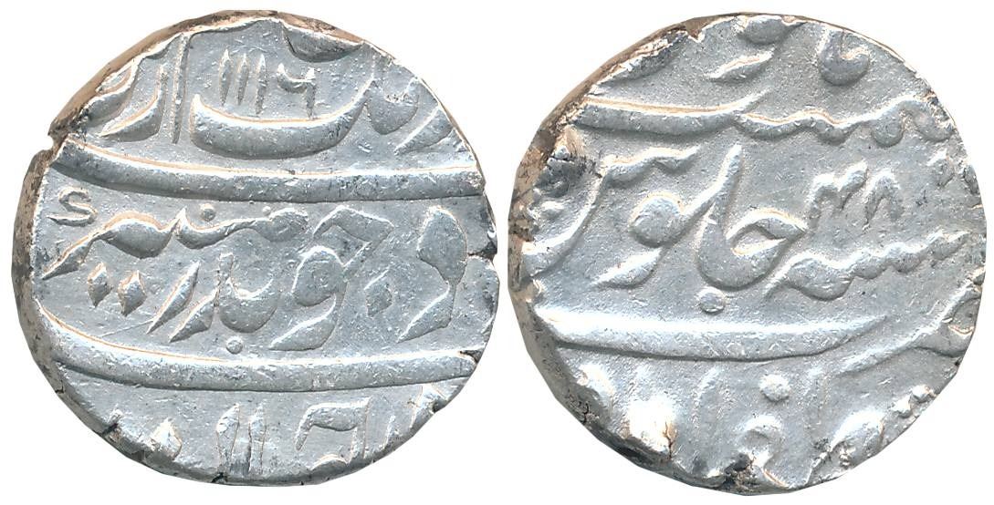Aurangzeb, Silver Rupee, 11.51g, Zafarabad Mint, AH 1116/ RY 48, Complete Mint name on bottom of reverse (KM# 300.93). Extremely fine.