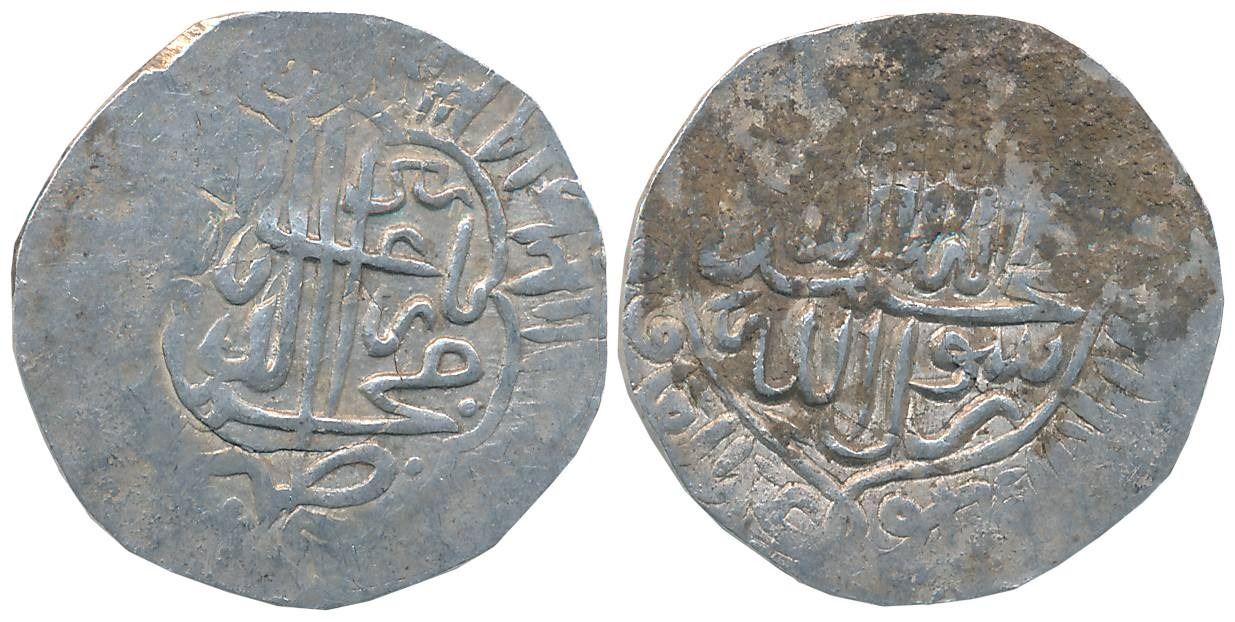 Babur, Silver Shahrukhi, 4.50g, Kabul Mint, AH 934, Obv: Name of the emperor with "Badshah Ghazi" title in a scalloped cartouche; other titles, mint and date around, Rev: Kalima in scalloped quatrefoil cartouche, names of Caliphs and titles around. Usual flatness otherwise very fine, rare.