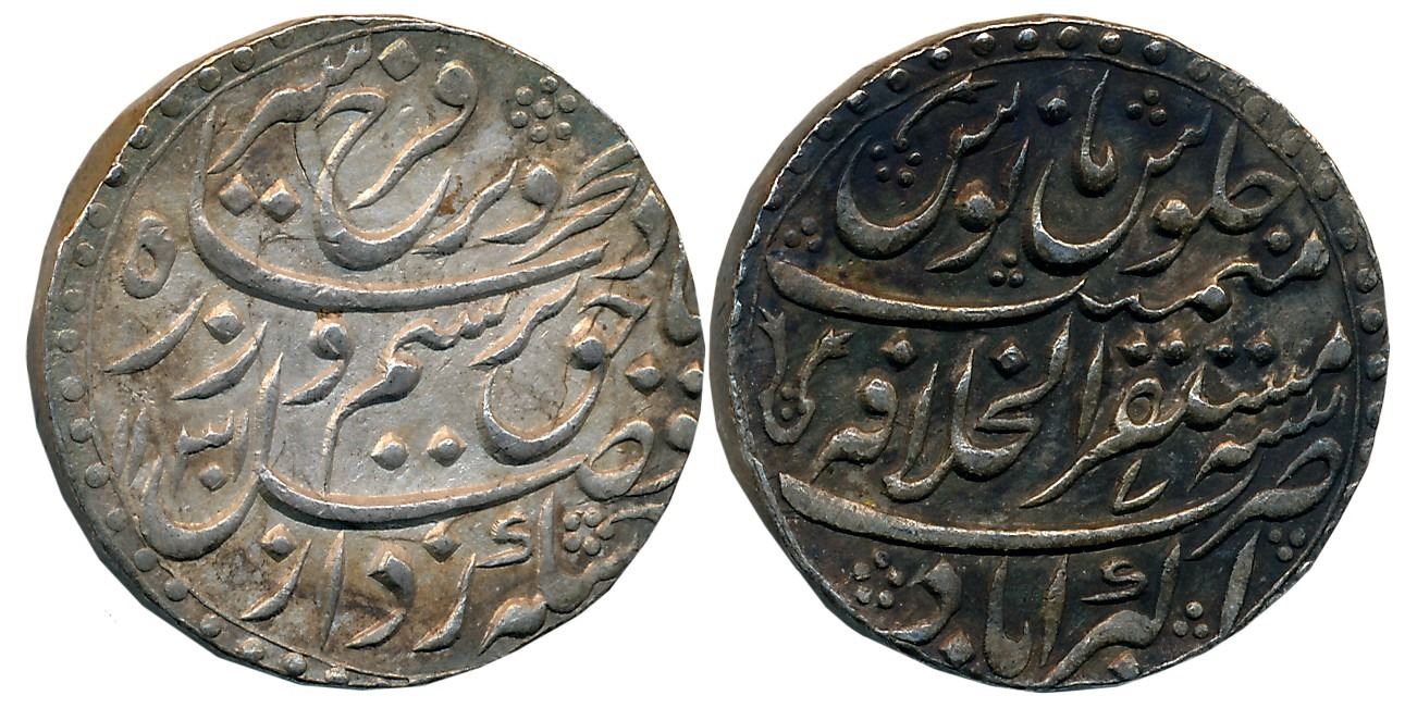 Farrukhsiyar, Silver Rupee, 11.39g, Broad Nazarana like flan, Mustaqir ul Khilafat Akbarabad Mint, AH 1131/ RY 7 (KM# 377.6). Extremely fine, very rare.