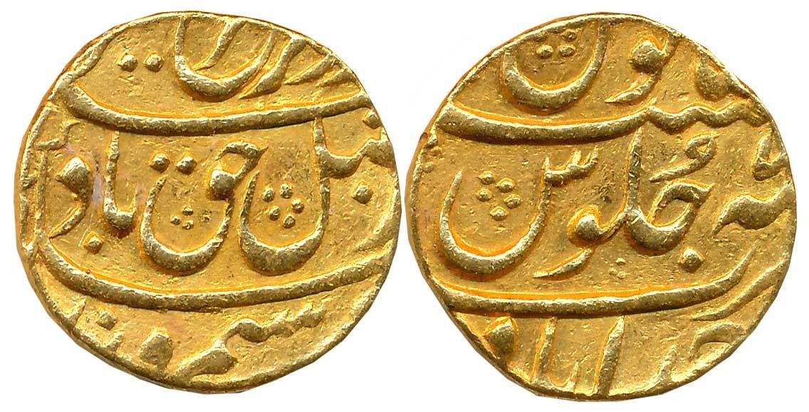 Farrukhsiyar, Gold Mohur, 11.03g, Ahmadabad Mint, RY 7 (KM# 390.36). Very fine, rare.