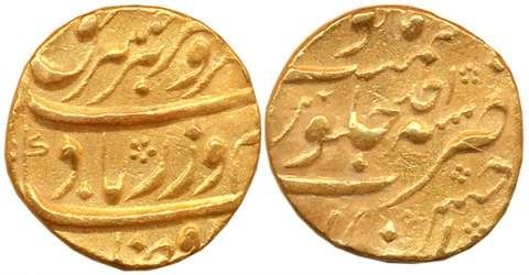 Ahsanabad was the Islamic alias of the city of Gulbarga, which was renamed by the Bahmani ruler Ala al-Din Hasan Bahman Shah after himself. The name had fallen in disuse after the Bahmani Sultanate ended. It was revived again by Aurangzeb towards the end of his reign. Minting at Ahsanabad had become very sporadic in early 18th century with gold issues being virtually unknown. This is the first gold coin known of the period. Although it bears the normal ‘Badshah Bahr wa Bar’ couplet of Farrukhsiyar, his name is written by joining ‘Kh’ and ‘S’ together. This feature is seen only on coins of couple of other mints, like Firozgarh.