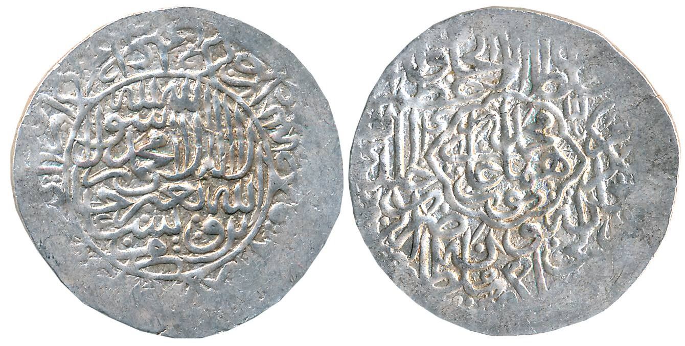 Humayun, 1st reign, Silver Shahrukhi, 4.72g, Agra Mint completely visible, Obv: Shahada and invocation “Yarzaqu Allah Man Yashao ba-Ghayr Hisab” in circle; names of Rashidoons and their titles around, Rev: “Muhammad Humayun Ghazi” in a Mihrab-shaped Cartouche, other titles and mint-name in margin. Very fine, rare.