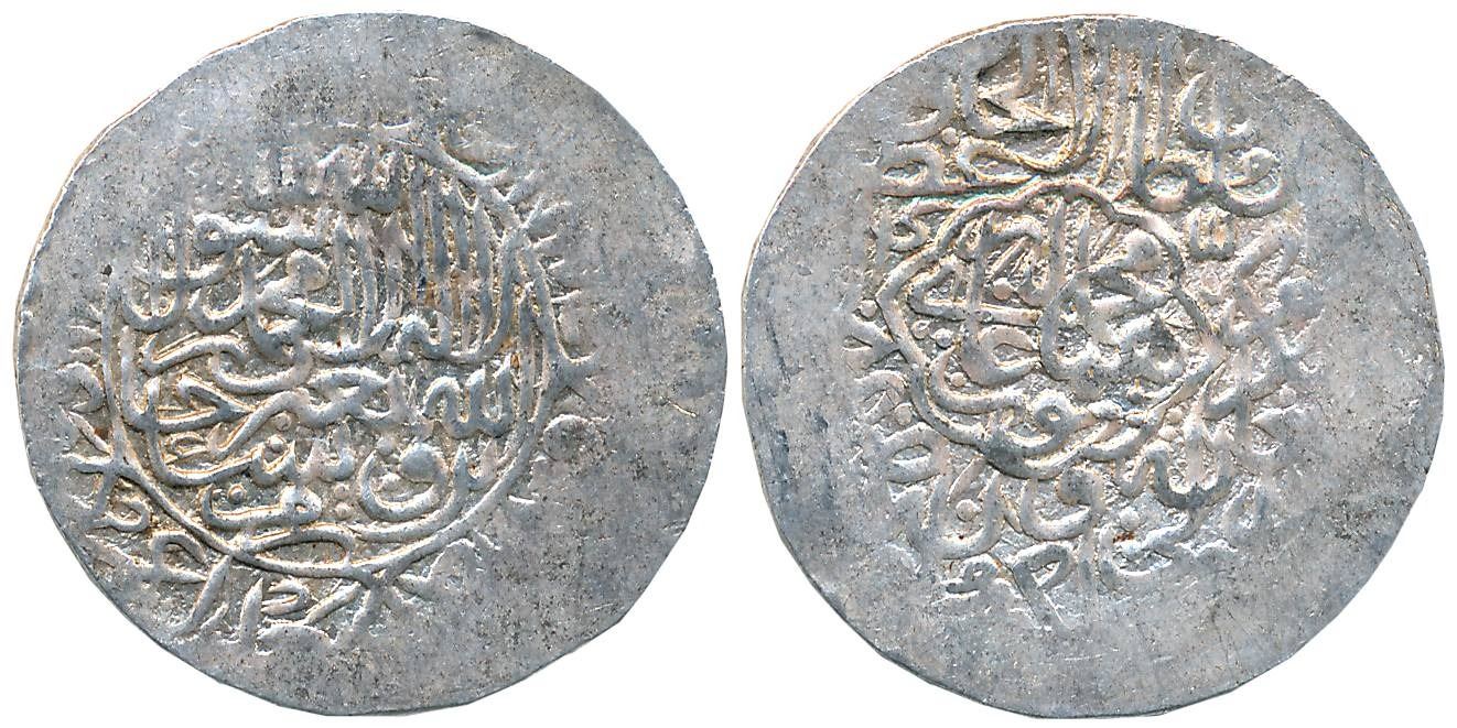 Humayun, 1st reign, Silver Shahrukhi, 4.76g, Agra Mint completely visible, Obv: Shahada and invocation “Yarzaqu Allah Man Yashao ba-Ghayr Hisab” in circle; names of Rashidoons and their titles around, Rev: “Muhammad Humayun Ghazi” in a Mihrab-shaped Cartouche, other titles and mint-name in margin. Very fine, rare.