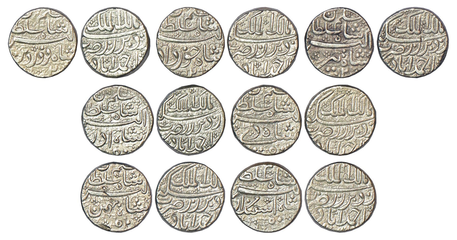 Jahangir (1605-1627 AD), silver rupee, with pre-accession name Salim, 7 different months, Ahmadabad mint, Farwardin-2, 11.28g, Khurdad-2, 11.29g, Tir-2, 11.29g, Azar-50, Di-50, 11.31g, Bahman-50, 11.23g and Isfandarmunz-50, 11.27g, KM 140.1-140.2. (7 different months).