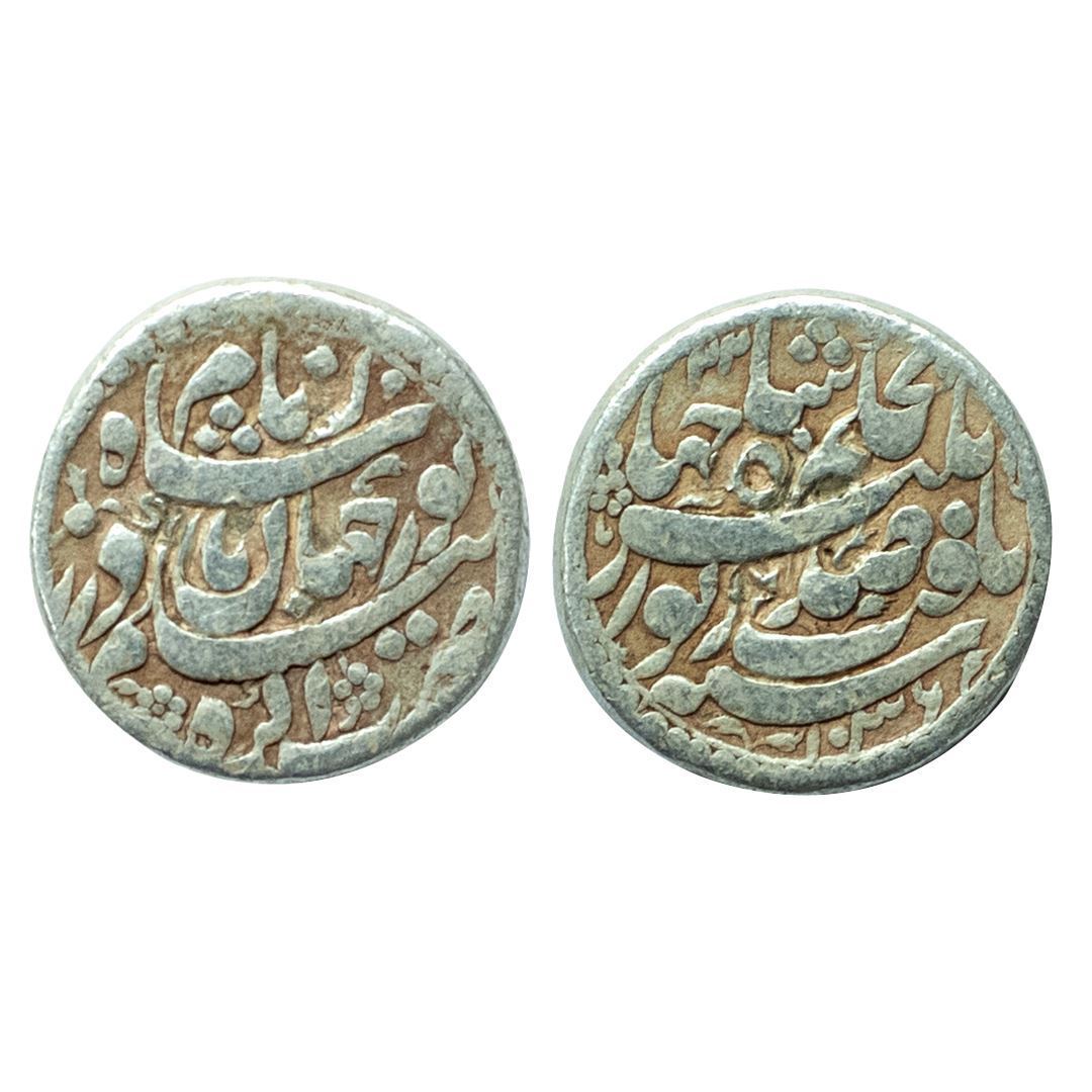 Mughals, Jahangir with the name of Noor Jahan (1623-1627 AD), silver rupee, Agra mint, 'Sad Zewar' couplet, 1036/RY 22, KM 168.1, 11.20g. Obv: Farsi hemistich ba-Hukm-i Shah Jahangir Yaft Sad Zewar, with AH and RY date. Rev: Farsi hemistich Za Naame Noorjahan Badshah Begam Zar; Zarb Agra. Restoration done to fill Test marks, Tooled.