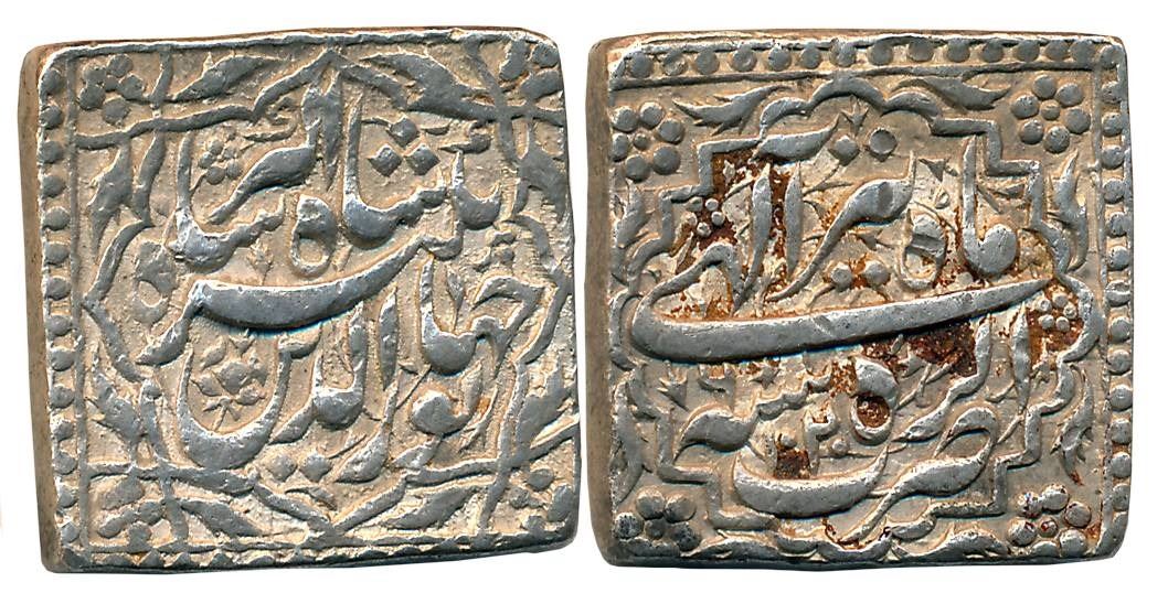 Jahangir, Silver Square Rupee, 11.40g, Agra Mint, Ilahi Month Tir, AH 1020/ RY 6, Obv: Persian legend “Noor al-Din Jahangir Shah Akbar Shah”, Rev: AH / RY details, Ilahi Month and Mint. Very fine+, extremely rare.