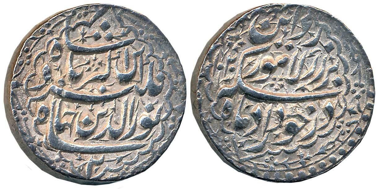 Jahangir, Silver Sawai Rupee (25% Heavy weight), 14.29g, Lahore Mint, Ilahi Month Amardad, AH 1020 / RY 2 (in error for RY 6), Obv: Persian couplet hemistich citing “Jahangir Shah Nur al-din Jahangir ibn Akbar Badshah” with RY at the bottom, in ornate Mihrabi border, Rev: Persian “hemistich Bar Zar Lahore zad Ain Sikka dar Khurdad Mah” in decorative Mihrabi border (ex-Manzoor Mirza collection). Extremely fine, exceedingly rare.