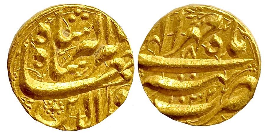 Jahangir, Gold Mohur, 10.95g, Tatta Mint, Ilahi Month Mihr, AH 1032/ RY 18, Obv: Persian legend “Noor al-Din Jahangir Shah Akbar Shah”, Rev: Mint name, Ilahi Month, AH and RY details Uncirculated, exceedingly rare in this grade.