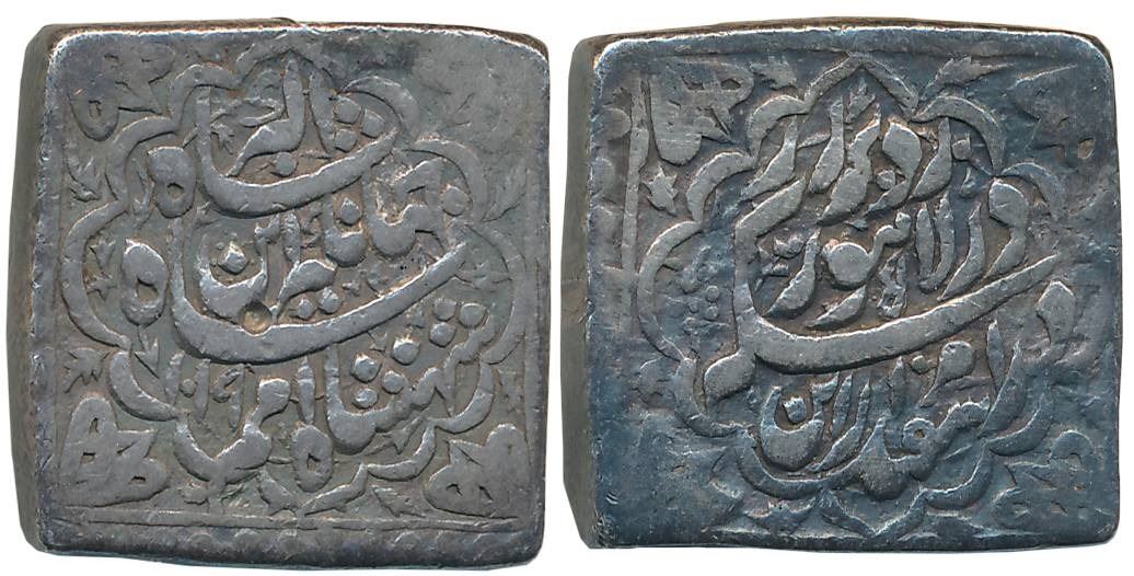 Jahangir, Silver Square Heavy Rupee, 14.16g, “Shahanshah- e- Oumam” couplet, Lahore Mint, RY 5, Obv: Persian legend “Shahanshah- e- oumam, shahe Jahangir ibn shah Akbar”, Rev: Persian legend “Darb Isfandarmuz ein sikka dar Lahore e zad bar zar” (The Emperor of the people/ Tribes Shah Jahangir son of Shah Akbar, Month Isfandarmuz, this coin struck in Gold at Lahore) (KM# 160.2). About very fine, extremely rare.