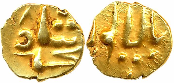 Muhammad Shah, Gold Fanam, 0.36g, Balapur Mint (KM# C440.2). Complete mint name on reverse. Extremely fine, rare.