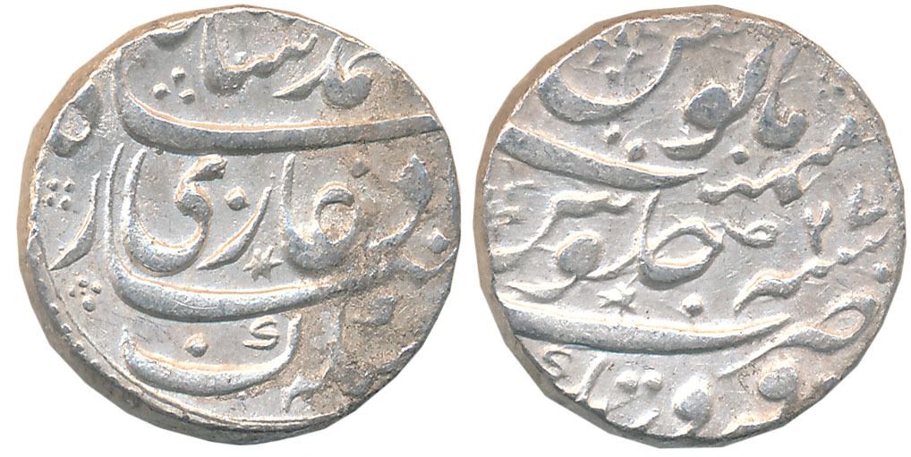 Muhammad Shah, Silver Rupee, 11.30g, Firoznagar Mint, RY 28, almost complete Mint name on bottom of reverse (KM# 436.71). Very fine+, rare.