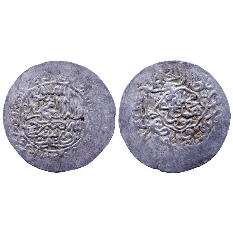 Nasir al-Din Muhammad Humayun, (A.H. 937-963, A.D. 1530-1540 and 1555-1556), Silver Shahrukhi, 4.74gms, Agra mint, AH 945, Obv: Kalima in circular linear border, with names of the four Companions around, Rev: 'Muhammad Humayan Ghazi' in angled hexalobe, mint in margin. Very Fine, Rare.