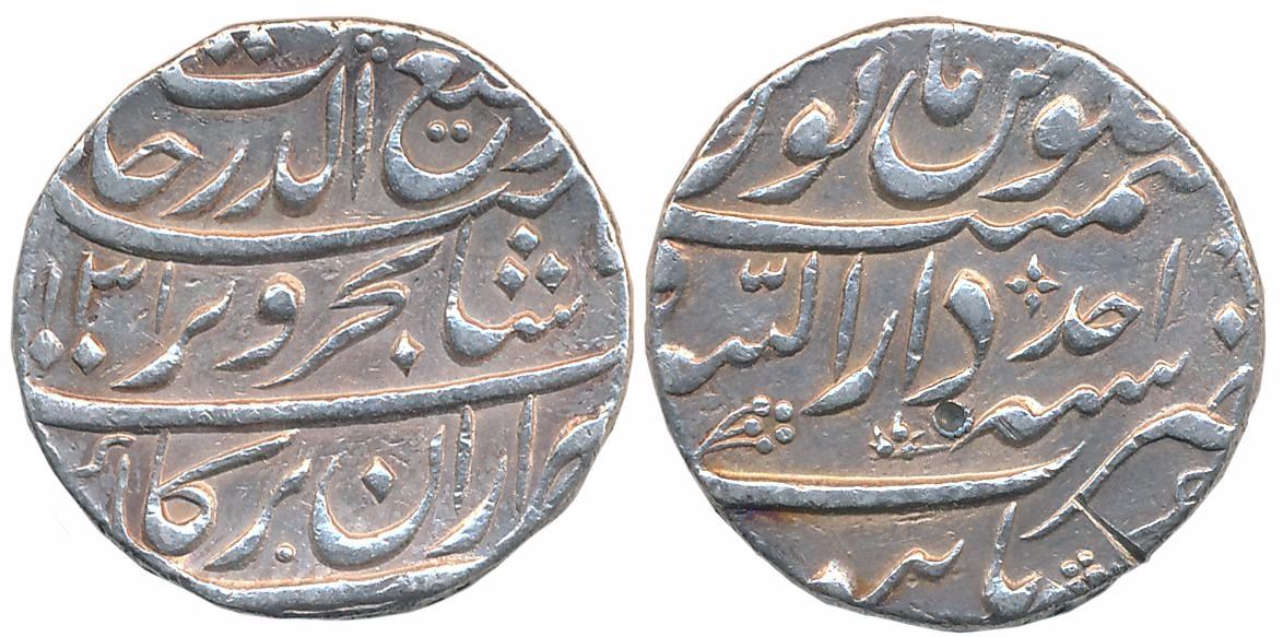 Rafi ud Darjad, Silver Rupee, 11.48g, Dar ul Sarur Burhanpur Mint, AH 1131/ RY Ahad (KM# 405.6). Tiny test mark on bottom of reverse otherwise very fine+, very rare.