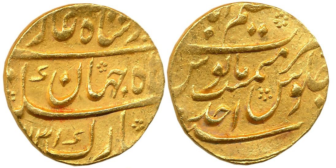 Shah Jahan II, Gold Mohur, 11.05g, Azimabad Mint, AH 1131/ RY Ahad (Not listed in KM). Very fine+, exceedingly rare.