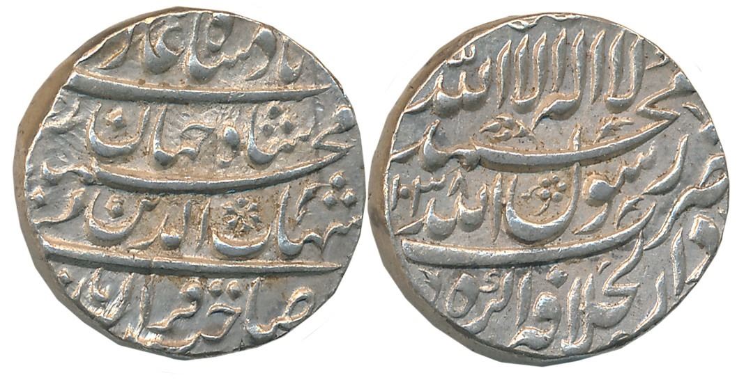 Shah Jahan, Silver Rupee, 11.40g, “Four Line Legend” type, Dar ul Khilafat Agra Mint, AH 1038, complete Mint name on bottom of reverse (KM# 222.1). About extremely fine.