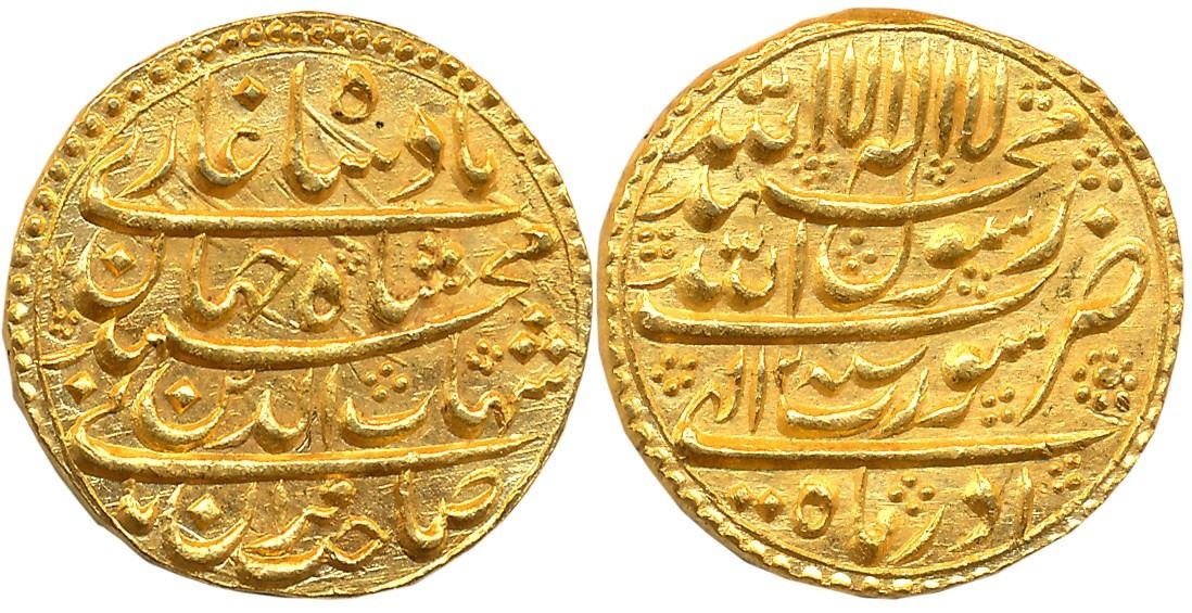 Shah Jahan, Gold Mohur, 10.95g, “Akola Hord” type, Surat Mint, RY 2, Ilahi Month Azar, Obv: Persian legend “Sahib Qiran Sani Shihab ud din Muhammad Shahjahan Badshah Gazi”, Rev: Kalma, Mint name & Ilahi Month (KM# 255.6). About uncirculated.