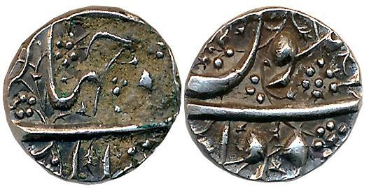 This type for Daulatabad mint was struck in the first reginal year of Shah Jahan, curiously while Daulatabad was still under Nizam Shahi control. It has a unique style of having an intricate floral backdrop for calligraphy, reminiscent of grape blossom. Fractional issues in this type are very rare with only a handful known. This is in all likelihood the first known 1/8th rupee fraction.