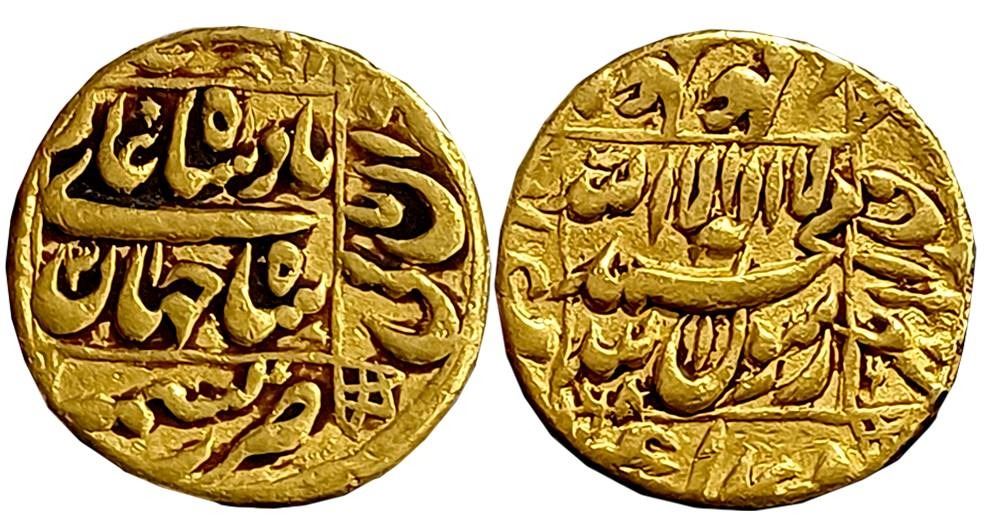 Shah Jahan, Gold Mohur, 10.77g, “Square areas” type, Kashmir Mint, AH 1068/ RY 31, central inscription within square, knots at corners on both sides (KM# 260.90). Very fine, extremely rare.