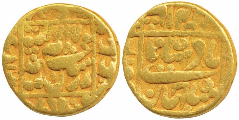Shah Jahan, Gold Mohur, 10.93g, Surat Mint, legend within square area, mint name in left margin (KM 260.15). Very Fine+.