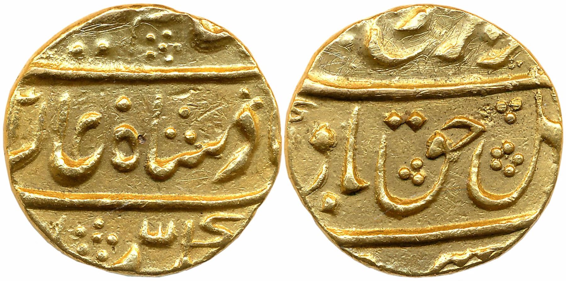 Imitation Mule Gold Mohur, 8.64g, one side couplet of Shah Alam & other side couplet of Farrukhsiyar. Very interesting, repaired & removed from loop. Very fine, extremely rare.