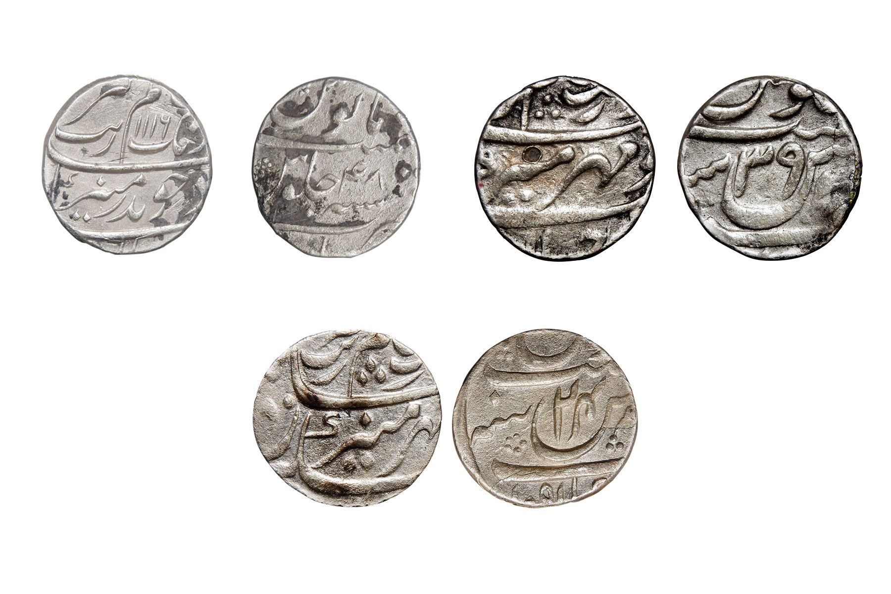 grams, Regnal Year 39, Ahmedabad Mint: 11.20 grams, dated AH 1116 / RY 48 and Akbarnagar Mint: 11.30