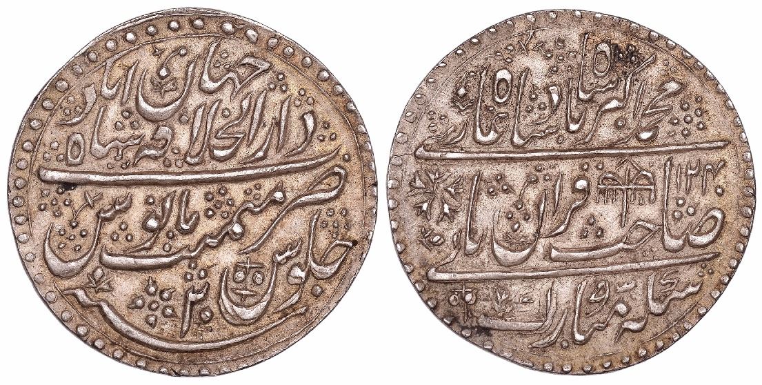 Muhammad Akbar II (AH 1221-1253, 1806-1837 AD), Silver Nazarana Rupee, 11.1g, Dar al-Khilafat Shahjahanabad Mint, AH 1240/20, complete die impression on both sides (KM. 779.1). Spectacular specimen, very broad flan, 35 mm, Extremely Fine, Very Rare.