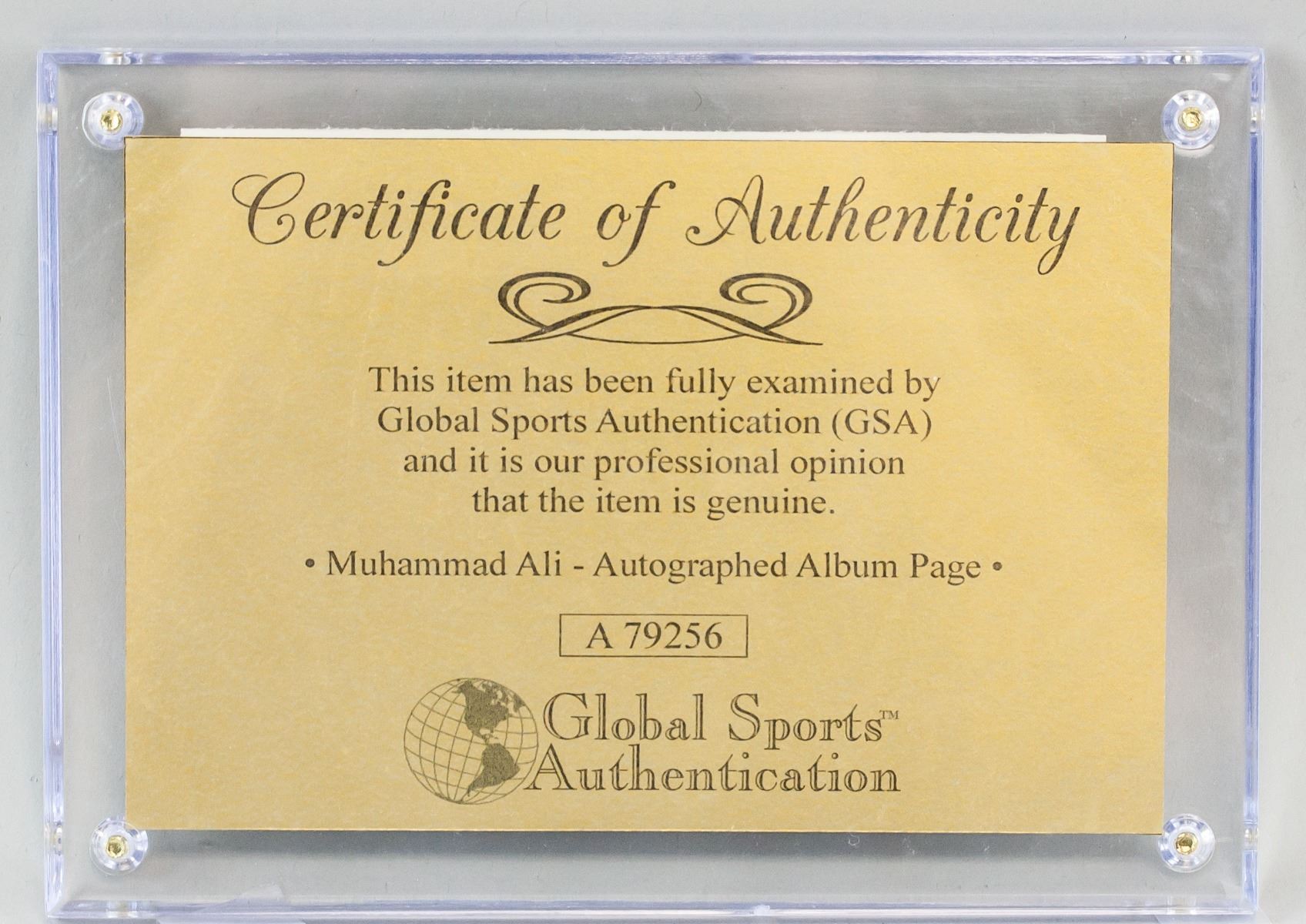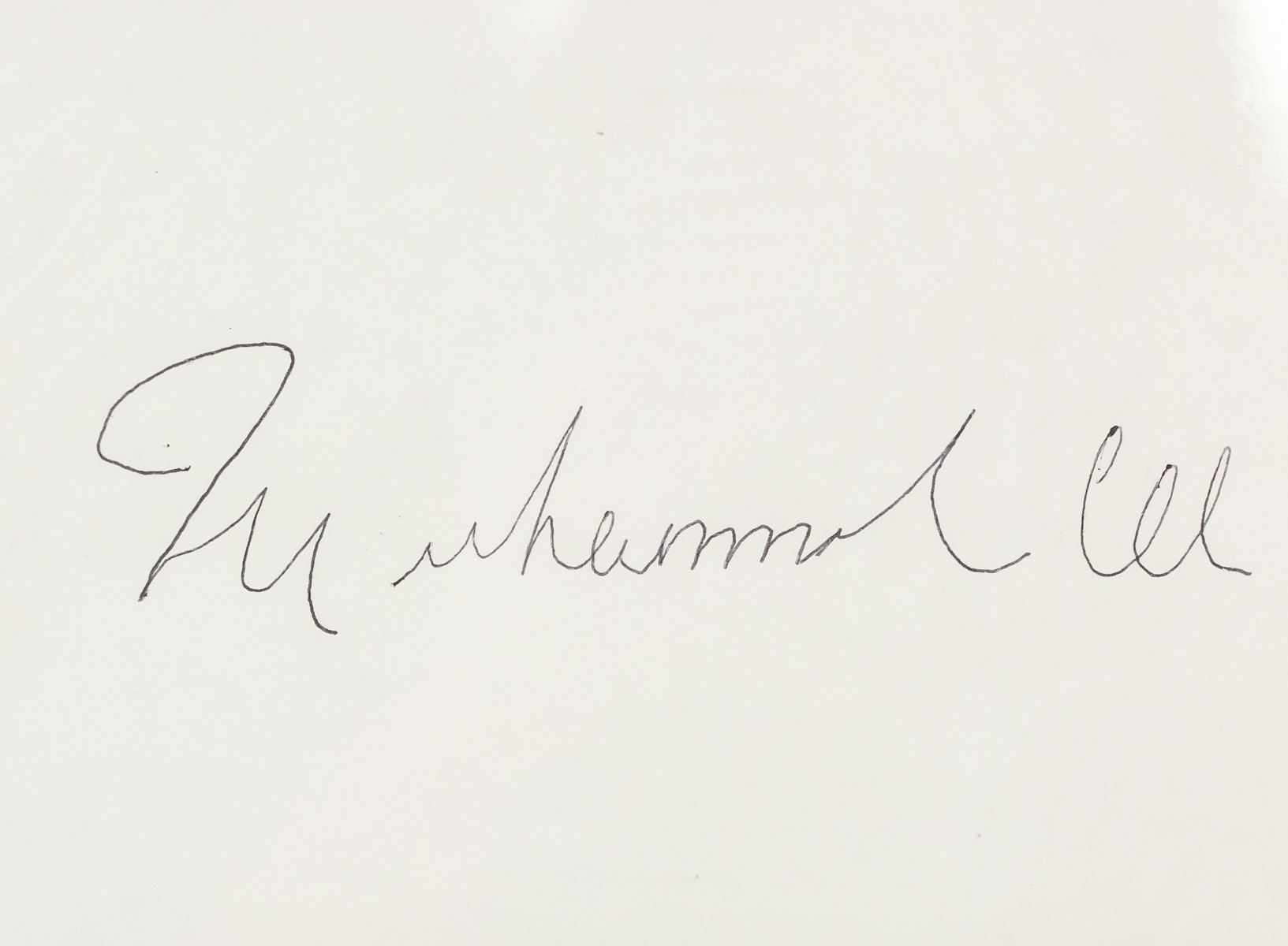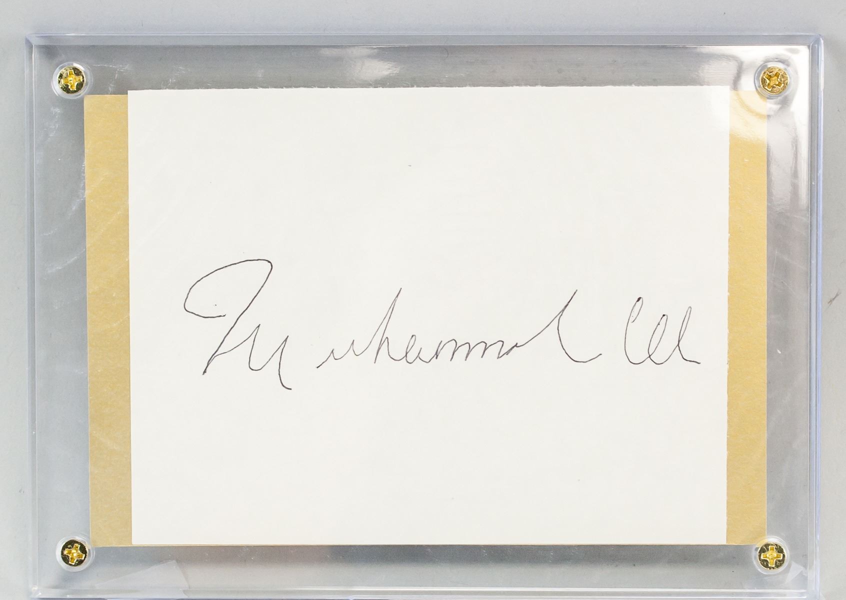 Muhammad Ali autograph pressed between glass. Accompanied with certificate of authenticity. 10.2 x 13.3 cm, Case size: 12.8 x 17.5 cm.