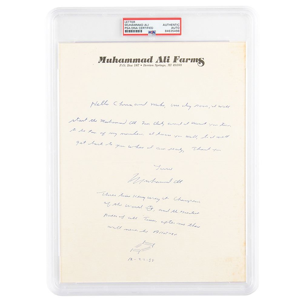 ALS, one page, 8.5 x 11, Muhammad Ali Farms letterhead, December 22, 1988. Handwritten letter to Chris and Mike, in full: "One day soon, I will start the Muhammad Ali Fan Club, and I want you two, to be two of my members. I know you well, so I will get back to you when I am ready. Thank you.†Below, Ali adds, “Three time Heavy Weight Champion of the World [small sketch of Earth], and the Greatest Boxer of All Times, after me there will never be ANOTHER,†and then draws a small sketch of a boxing ring. In fine condition, with light toning to right side. Encapsulated in a PSA/DNA authentication holder.