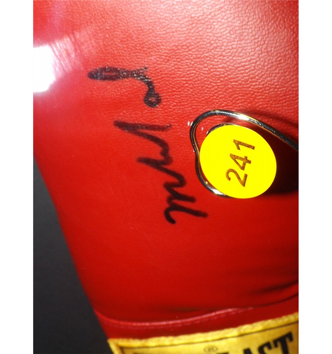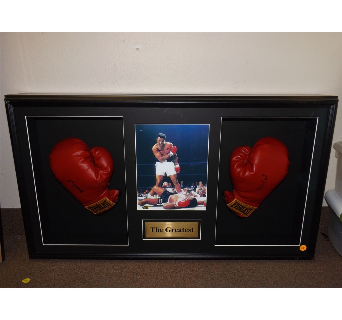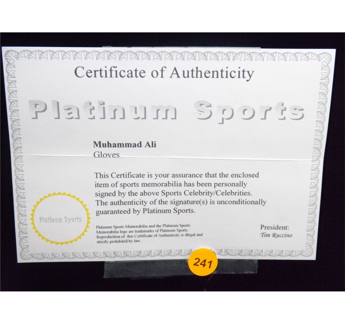 Muhammad Ali Autographed Boxing Gloves. Boxed pair of Autographed Everlast Gloves. Signature on chest of picture. Appraised or estimated retail value $5000. COAs by Platinum Sports and Signature Dreams. All Sales Final. Please see terms and conditions of auction.