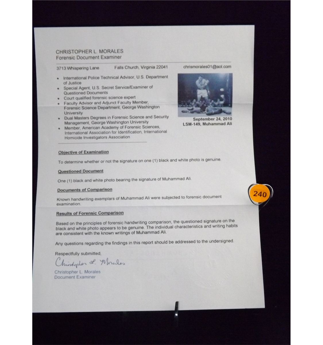 Muhammad Ali Autographed Photo. Framed Photo. Appraised or estimated retail value $2100. COA by Christopher Morales. All Sales Final. Please see terms and conditions of auction.