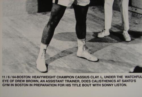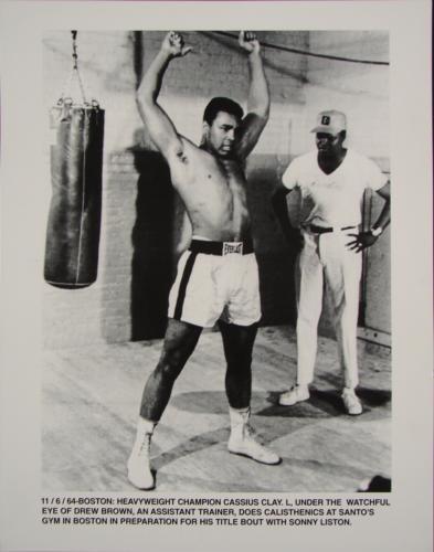 Muhammad Ali, then Cassius Clay, prepares for his big Sonny Liston fight with trainer Drew Brown, as shown in this great behind the scenes photo. The 11" x 14" B & W photo is in excellent condition, and ready to be framed. Underneath is printed some description, dated 11/6/64.