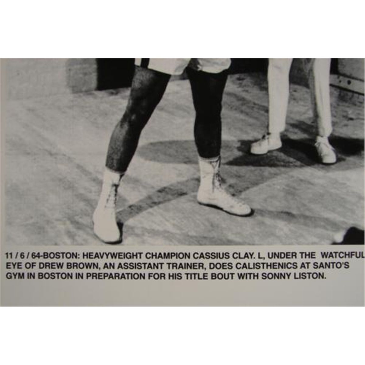 Muhammad Ali, then Cassius Clay, prepares for his big Sonny Liston fight with trainer Drew Brown, as shown in this great behind the scenes photo. The 11" x 14" B & W photo is in excellent condition, and ready to be framed. Underneath is printed some description, dated 11/6/64. * This is a great tribute to the legend just prior to making another round of history.