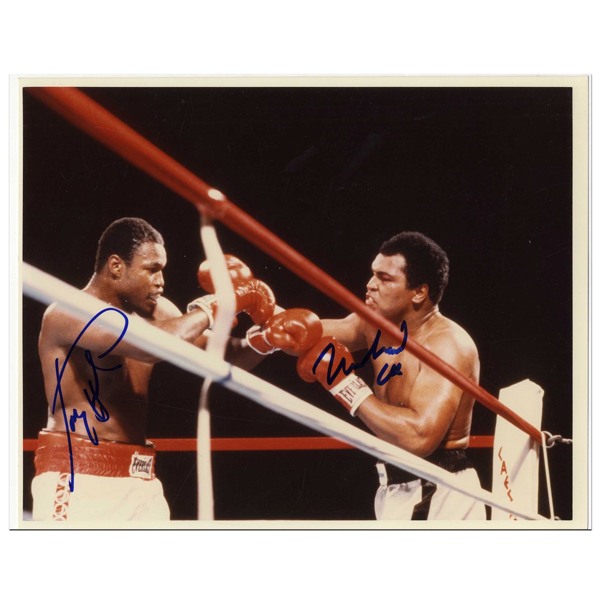 10'' x 8'' glossy signed photo of Muhammad Ali and Larry Holmes in the ring during the 1980 fight for the heavyweight title. Both fighters sign boldly in blue ink. Accompanied by certificate of authenticity from Michael Wehrmann. Very good condition