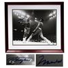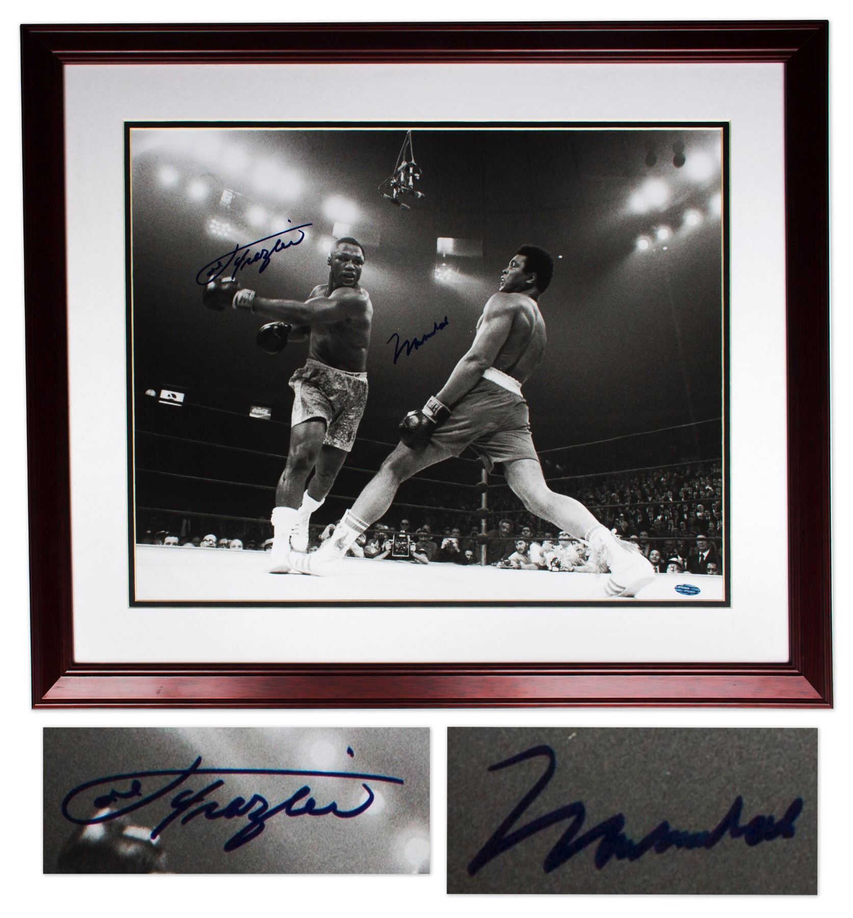 Fantastic photo signed by Muhammad Ali and Joe Frazier as they battle against each other in the ''Fight of the Century'' on 8 March 1971 at Madison Square Garden. Photo shows Ali dodging Frazier's legendary left hook. Photo measures 20'' x 16'', framed to 26.75'' x 22.75''. Near fine condition. With Steiner COA.