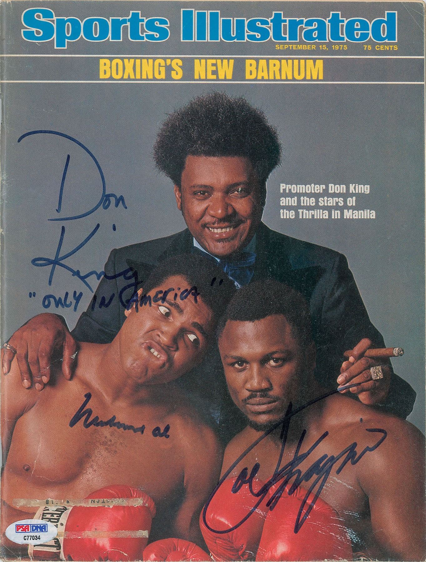 Sports Illustrated magazine from September 15, 1975, showing promoter Don King with his hands resting on the shoulders of heavyweight rivals Muhammad Ali and Joe Frazier, 98 pages, 8.25 x 11, signed on the front cover in black felt tip by all three. In fine condition, with light handling wear, old mailing label residue, and a PSA/DNA label affixed to lower left. Accompanied by a full letter of authenticity from PSA/DNA.