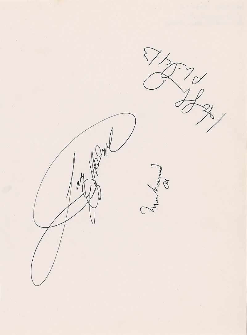 Ink signatures, “Muhammad Ali,” “Larry Holmes,” and “Holyfield, Phil 4:13,” on an off-white 10.5 x 7.75 sheet. In fine condition. Accompanied by a full letter of authenticity from PSA/DNA.