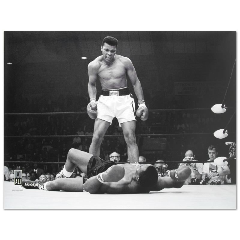This photo, commemorating Ali and Sonny Liston's anticipated fight, is part of sports history. Taken during the first-round knockout of his championship fight against Liston, this photo is sure to complement any sports memorabilia collection. This is a licensed photograph on Kodak Professional Endura paper. Measures approx. 40" x 30" (no border).