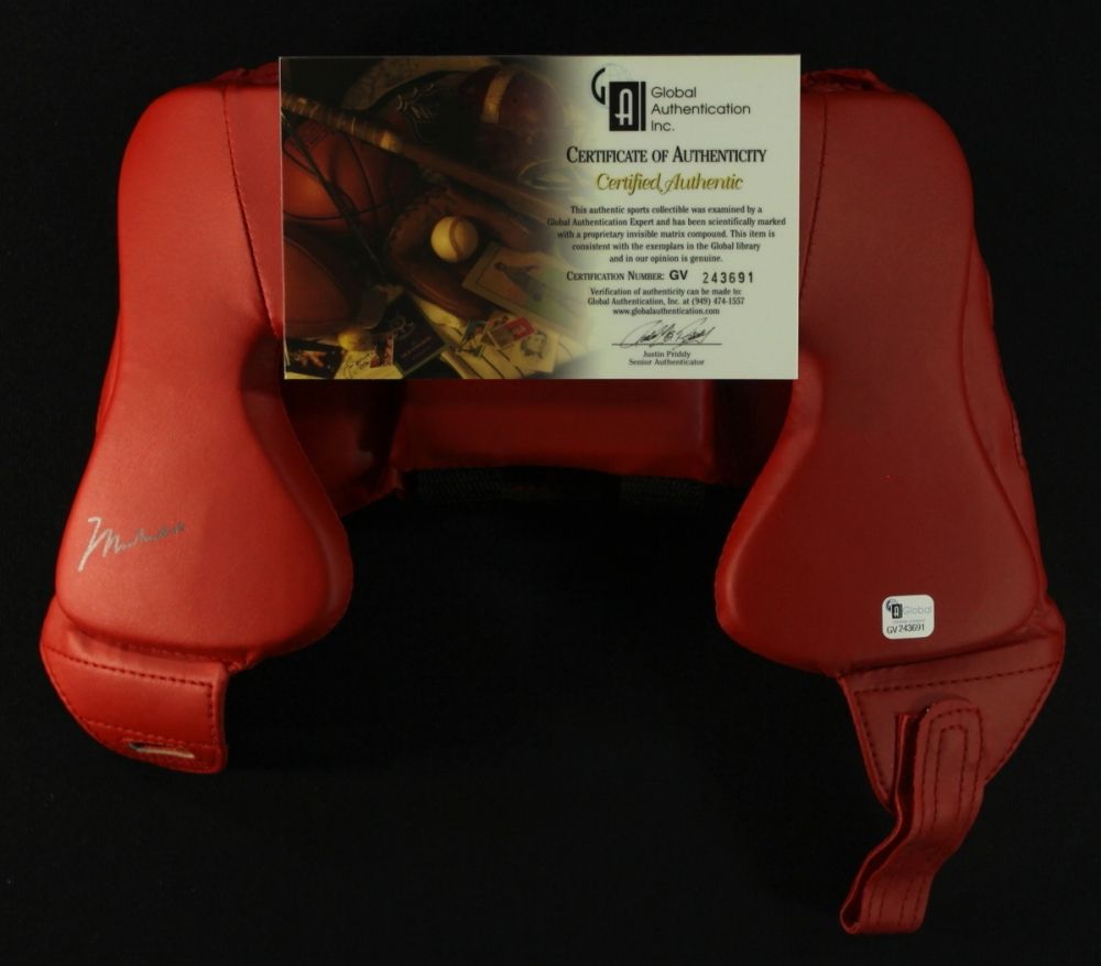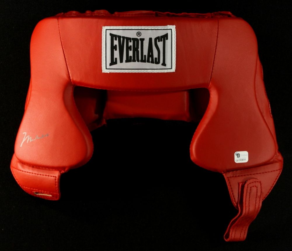 Everlast boxing Headgear. Hand-signed in black felt tip pen by Muhammad Ali. The autograph includes a Global Authentics (GA) hologram and matching COA for authenticity purposes.