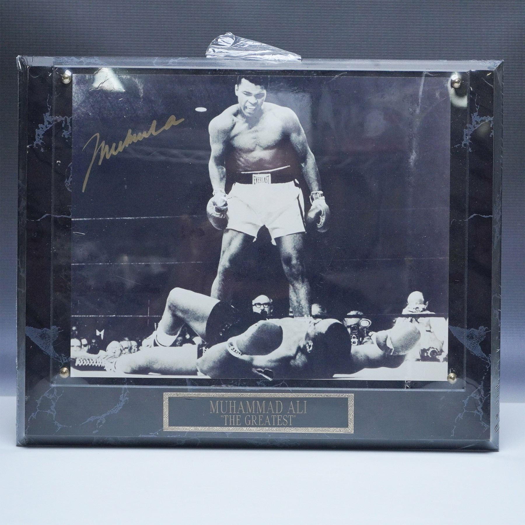 This remarkable piece features a black-and-white photograph of Muhammad Ali, capturing his iconic victory pose over Sonny Liston—a defining moment in boxing history. Personally signed by Ali, the photograph comes with a Certificate of Authenticity from Big Apple Authentic, ensuring its genuineness. The image is elegantly mounted on a black marble-style plaque with gold-tone accents and includes a nameplate inscribed with "Muhammad Ali - The Greatest." Measuring 13 inches in length and 10.5 inches in height, this collectible is a must-have for sports enthusiasts and boxing memorabilia collectors.