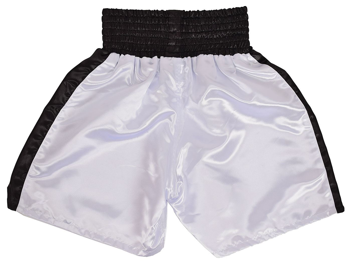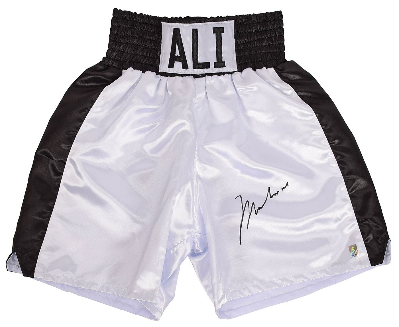 Attractive pair of black-and-white 100% polyester boxing trunks, size large, with waistband featuring embroidered name patch, "ALI," signed on the left thigh in black felt tip by Muhammad Ali. In very fine condition. Accompanied by a certificate of authenticity from Muhammad Ali Enterprises.